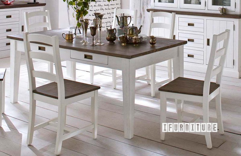 Solid acacia wood made 1.8m dining table and 6 dining chairs. A piece from our GOMERA Acacia Two Tone Cottage Country Style living and dining series. It characters thick acacia solid wood top and painted white semi solid acacia body structure, clean straight lines and antique look brown basalt handles.