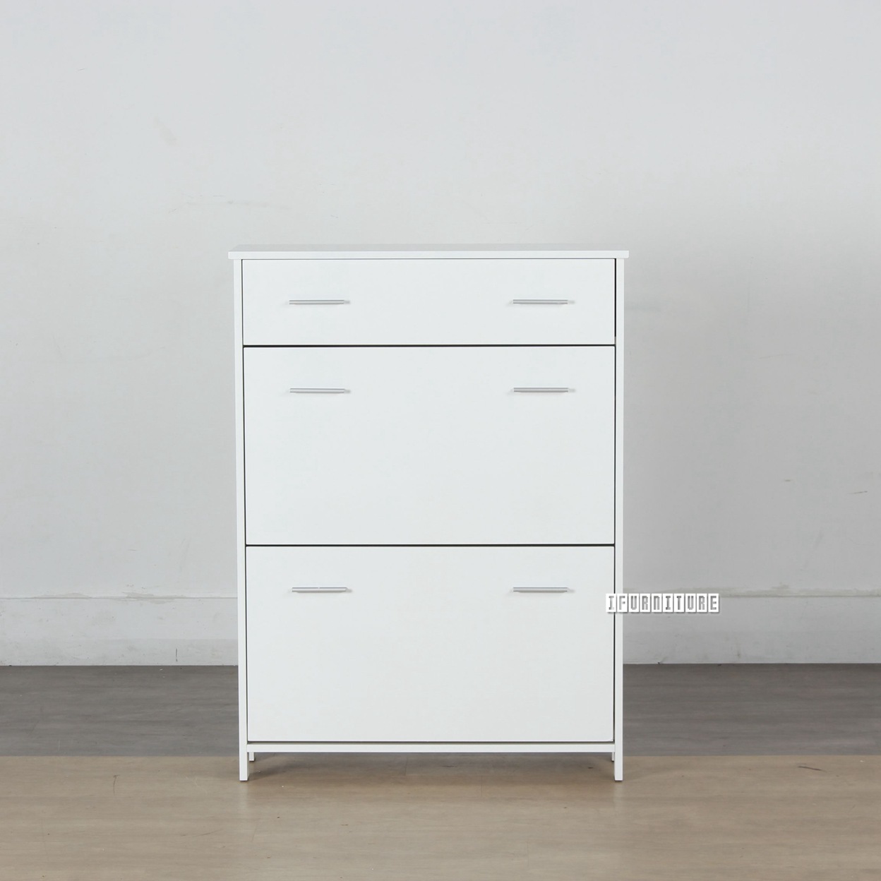 This shoe cabinet has an upper drawer, and two flip-open shelves beneath, while holes in the back provide ventilation.