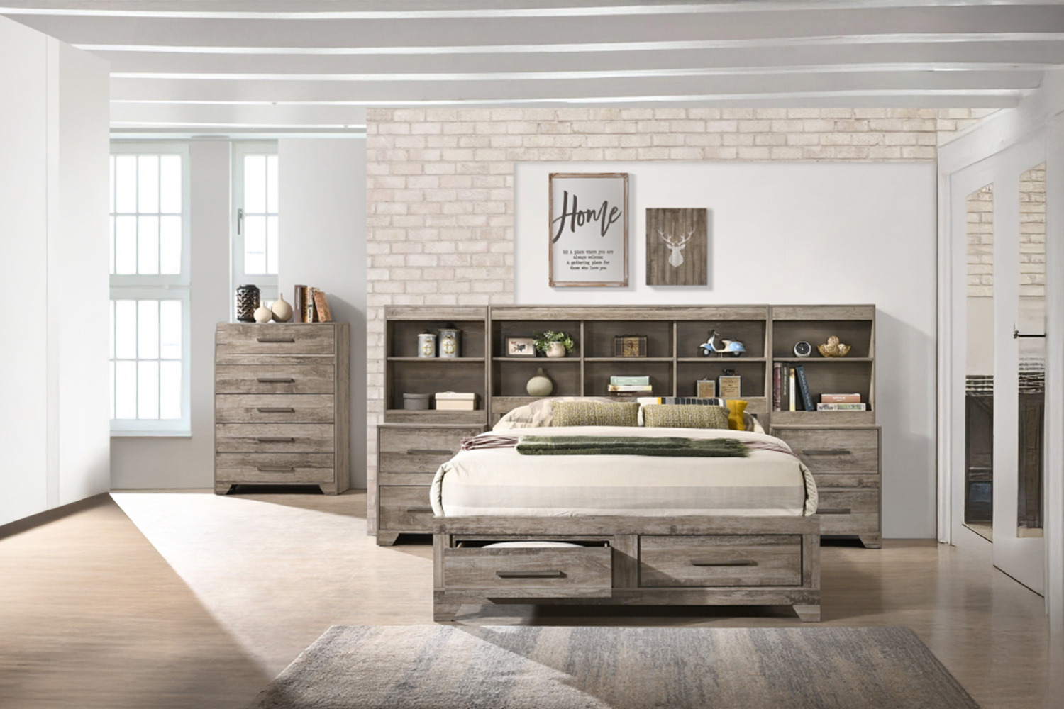 Transform your bedroom with the AGILENT Bedroom Set, available in 4-piece combo options to fit your space and storage needs. The bed features built-in headboard shelves and footboard storage drawers, while the chest, dresser with mirror, bedside table, and side pier combine modern farmhouse style with practical functionality for a clutter-free space. Elevate your room with this stylish, organized set designed to enhance both your decor and daily life.