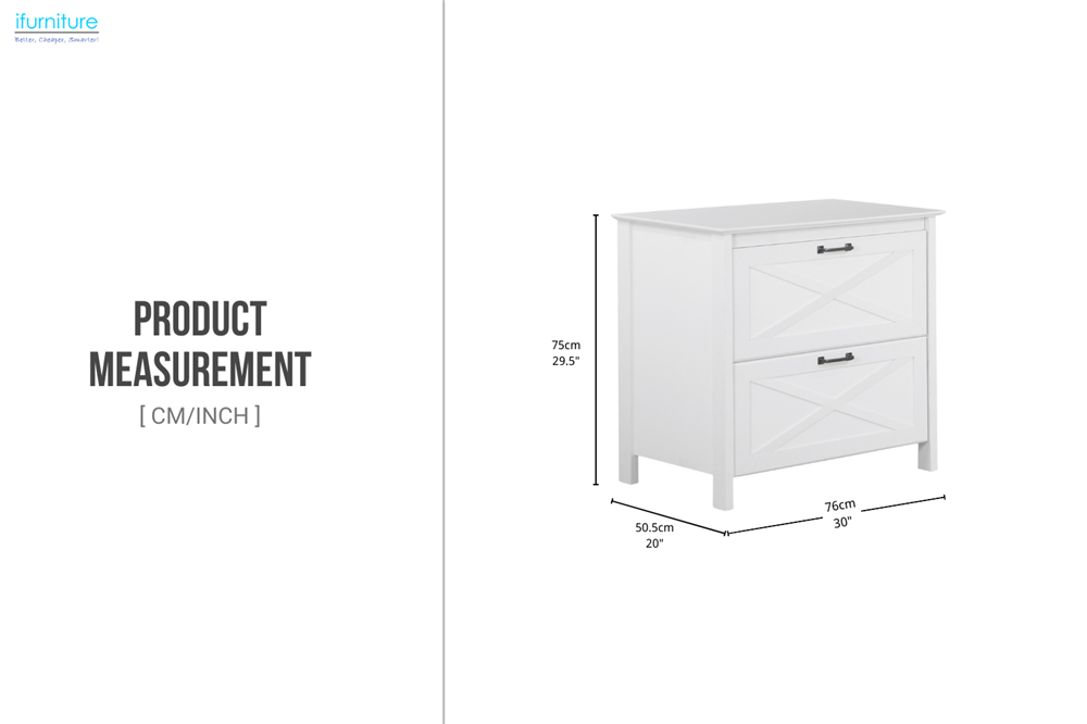 This two-drawer file cabinet offers practical storage for files and everyday office essentials in a clean, timeless design. Barn-style X-panel drawer fronts add subtle farmhouse character, while metal bar handles provide a refined, structured touch. Finished in crisp white, it brings a bright and versatile look that complements modern, coastal, and farmhouse interiors.