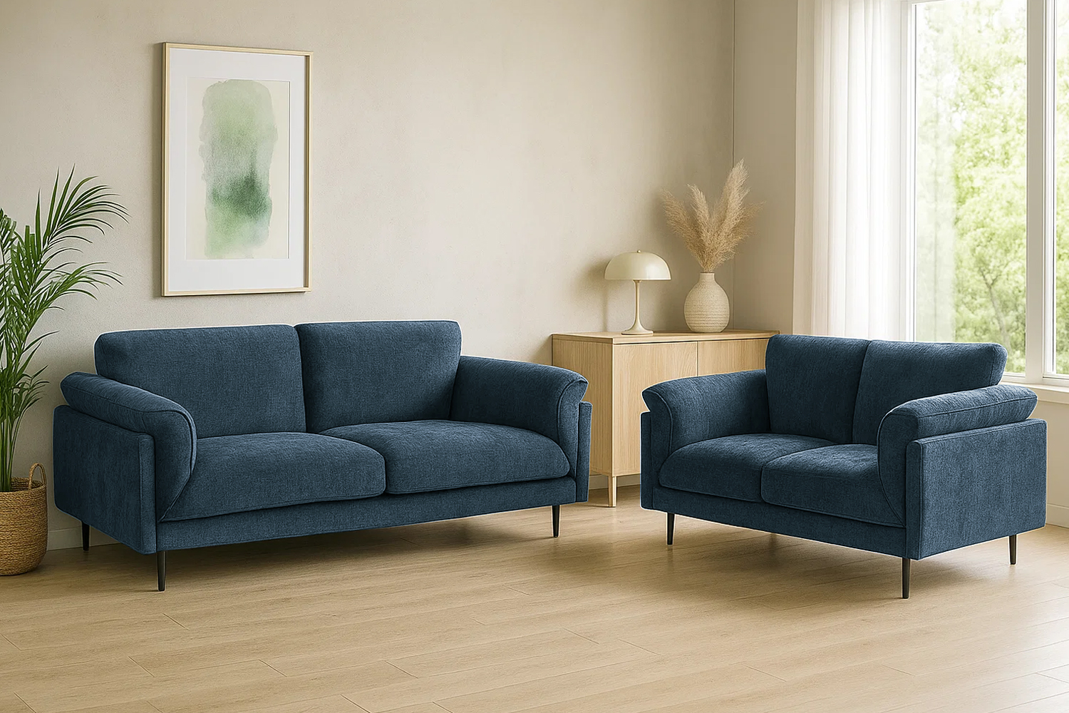 The Navy Blue BAMBERG 3/2 Seater Fabric Sofa Range blends modern elegance with everyday comfort. Its clean silhouette, deep navy hue, and refined proportions make it a timeless centrepiece for any living room. Plush cushions provide a soft yet supportive seating experience, while the slim metal legs create a light, airy feel that enhances your space. Available in both 3-seater and 2-seater sizes, it’s the perfect combination of style, comfort, and versatility.