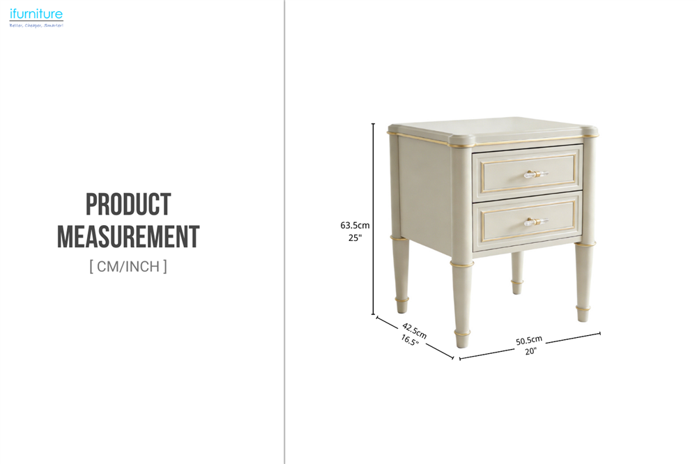 This bedside table features a clean two-drawer design with subtle decorative trim for a refined, classic look. Gently curved corners and tapered legs add elegance to the overall silhouette, while the light neutral finish allows it to blend effortlessly with classic, transitional, and modern bedroom interiors.