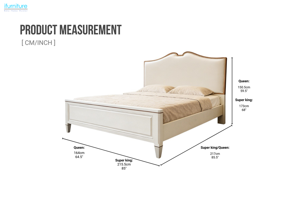 This bed frame features a softly upholstered curved headboard with refined trim detailing, paired with a sturdy panel frame for a clean, structured look. Finished in a light neutral tone, it suits classic, transitional, and modern bedroom interiors with ease.