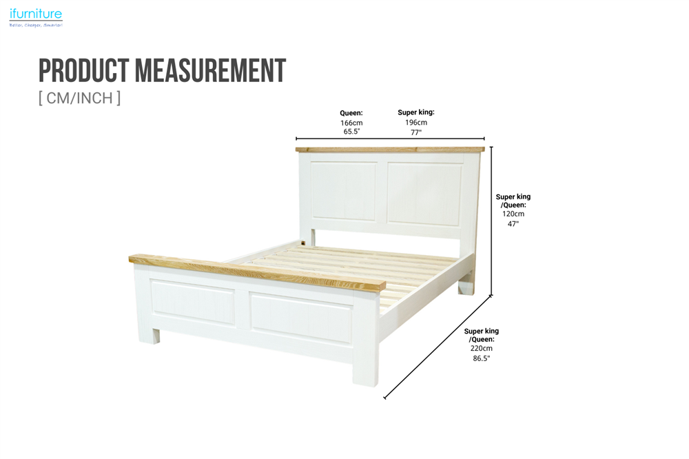 Crafted from durable solid New Zealand pine, this bed frame offers strong, long-lasting support with a clean and timeless look. The headboard and footboard are accented with warm oak-veneer tops, adding natural texture and a premium touch to the bright white painted finish. Vertical panel detailing enhances its classic farmhouse and coastal style, making it an easy fit for both modern and traditional bedrooms.