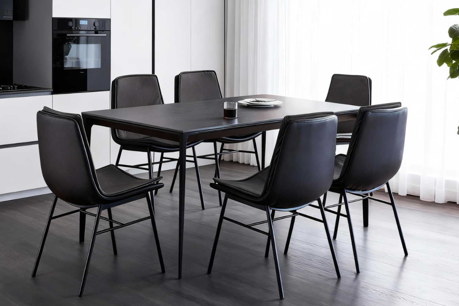Enhance your dining space with a sleek and modern table featuring a dark grey matt ceramic top that’s not only stylish but also resistant to scratches and stains for lasting beauty. Supported by robust black steel legs with a painted black sand finish, this table offers a strong and stable foundation that perfectly complements its contemporary design. Available in both 5-piece and 7-piece options, this versatile set provides the perfect balance of elegance and functionality, making it an ideal choice for any dining room or kitchen.