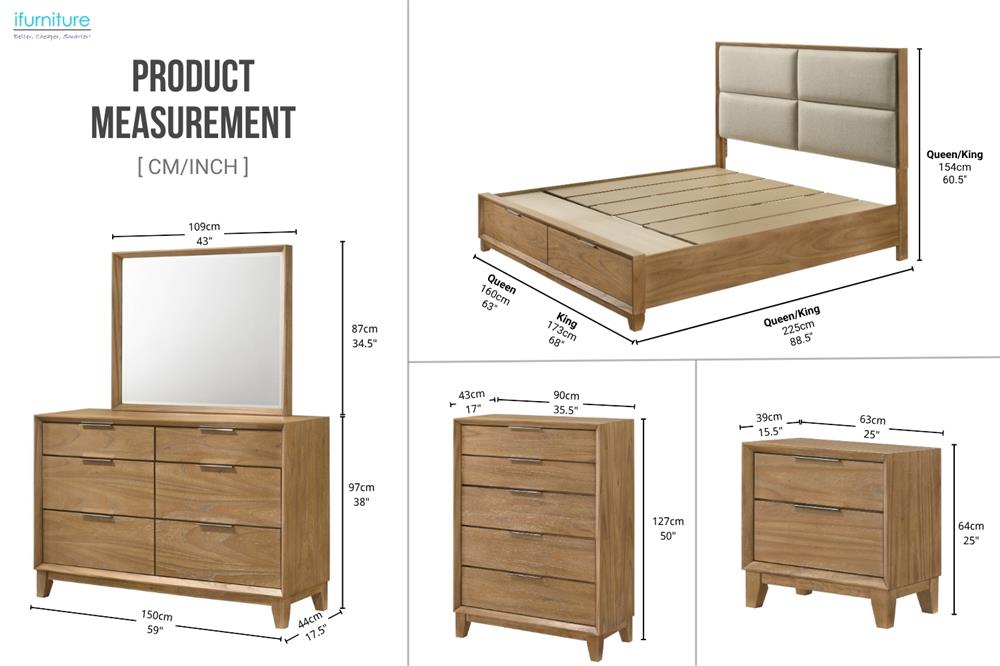 This stylish bedroom combo set offers both functionality and elegance. Featuring generous storage with drawers in the bed footboard, bedside tables, tallboy, and dresser, it provides ample space for your clothing and essentials. The upholstered panel headboard adds comfort and warmth to your bedroom, while the solid wood construction with Mindy veneer ensures lasting durability. The sleek tapered leg design enhances the modern look, and the smooth metal handles provide easy access to your drawers, completing this beautiful set.
