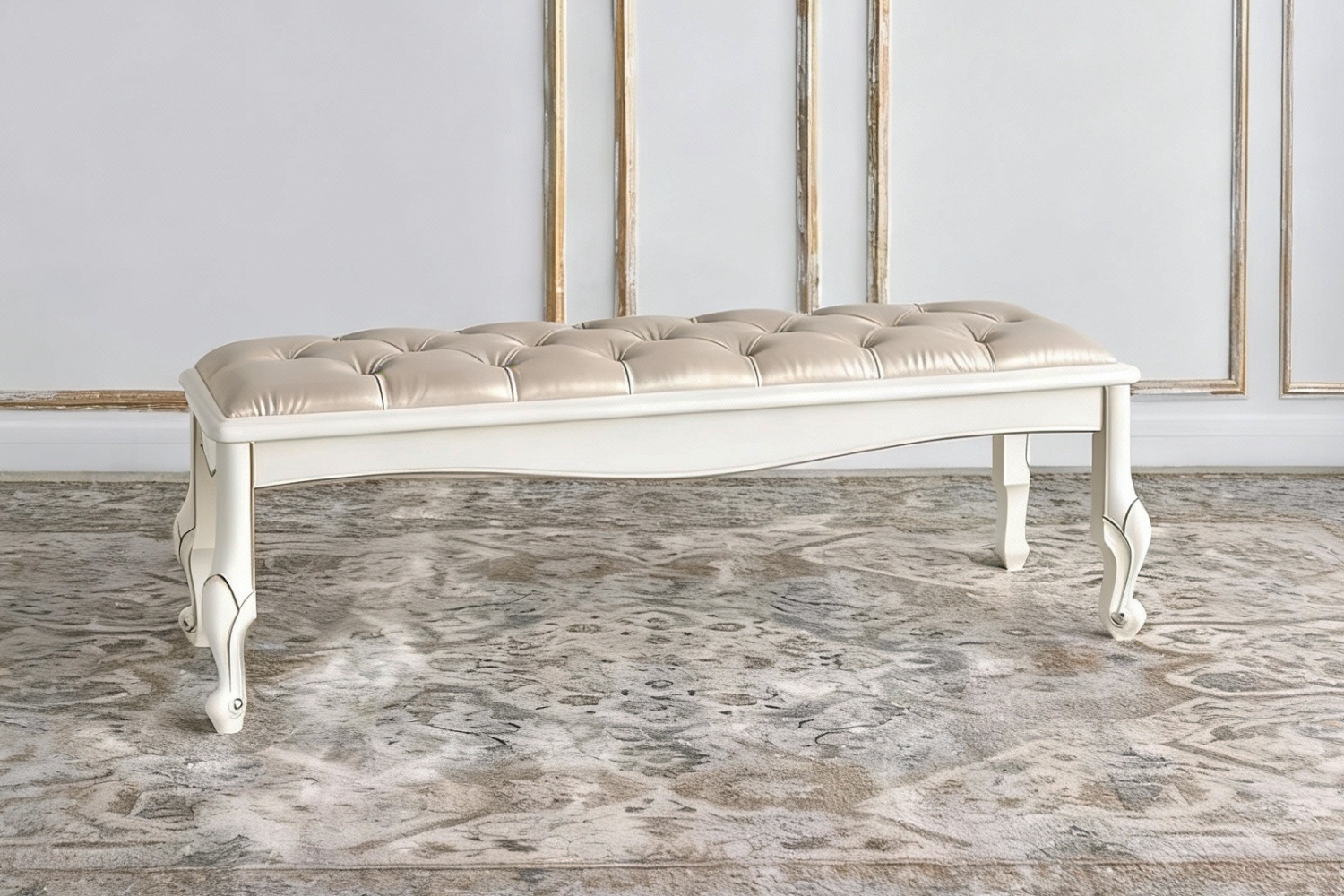 This elegant bench features a button-tufted upholstered top for refined style and comfortable seating. A smooth sturdy structure and sculpted curved legs provide lasting stability and classic appeal. Finished in a soft neutral tone, it works beautifully as a bedroom, entryway, or living room accent.