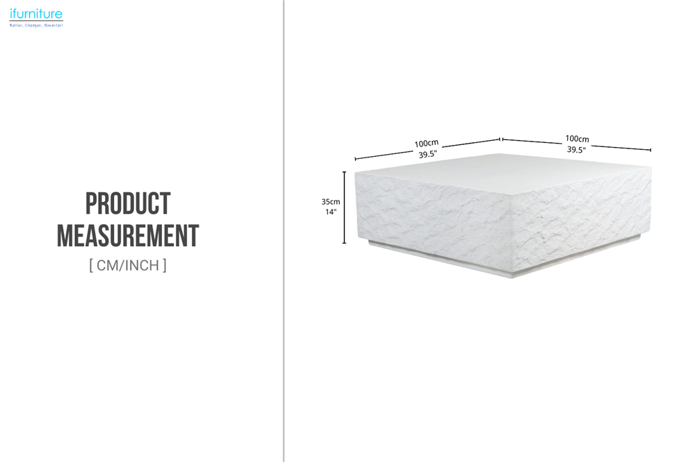 Crafted from sturdy yet lightweight FRP(Fiberglass Reinforced Plastic), this coffee table blends everyday functionality with artistic appeal. The chiseled, stone-like texture along the sides adds sculptural charm, while the smooth flat top provides a practical surface for décor and daily items. Its modern, minimalist cube design makes it a striking addition to any contemporary living space.