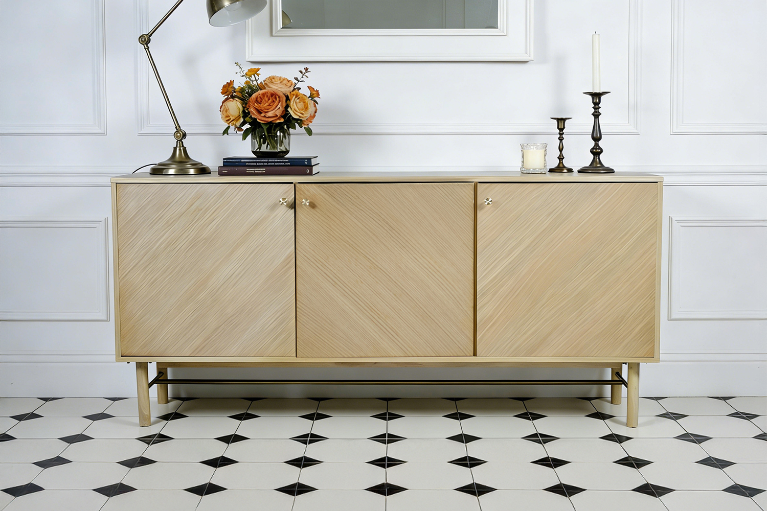 This three-door cabinet features practical internal shelving for organised storage of tableware and household items. Raised legs with an integrated support rail provide stable support while keeping the design visually light. Finished in a soft light oak tone with clean lines and simple round pulls, it offers a warm, contemporary look for modern interiors.