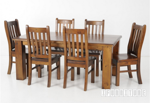 Solid pine made dining table and chairs combo deals in rustic federation design.  5 Sizes available: 150x100 5PC/150x100 7PC/180x100 7PC/210x105 9PC/240x1200 11PC.