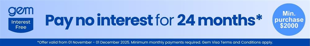 *Credit and lending criteria and fees apply, including a Gem Visa $55 fee and annual fee of $65 Gem Visa (charges $32.50 half yearly) / $65 Gem CreditLine (charged $32.50 half yearly). Interest rate (currently Gem Visa 29.49% p.a. / Gem CreditLine 29.95% p.a.) applies after any interest free term ends. Paying only the minimum monthly repayment of 3% of the outstanding monthly balance or $20 (whichever is more), will not be sufficient to repay the purchase amount(s) within the promotional period. Amount payable will be shown on your monthly statement. For cash advances, an interest rate of 29.95% p.a. and a fee of ($2 Gem Visa / $6 Gem CreditLine) applies. Available on participating Gem Visa or Gem CreditLine credit cards only. New customers must apply and be approved for a Gem Visa credit card. Further information on rates and fees can be found at gemfinance.co.nz. Credit provided by Latitude Financial Services Limited.