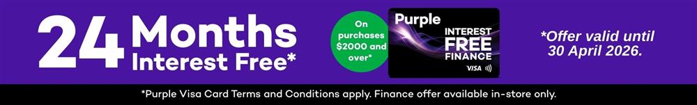 *24 months interest free is available on purchases $2000 and over using Purple Visa Card. Purple Visa Card Terms and Conditions, credit criteria and Rates and Fees (including a $55 establishment fee and a $55 annual fee) apply. Prevailing Purchase interest rate of 26.65% p.a. will apply to any outstanding balance at the expiry of the interest free period and a Cash Advance rate of 29.40% p.a. also applies (Rates and Fees current as of 1 April 2024 and subject to change). Purple Dollars Terms and Conditions apply and can be redeemed at Participating Retailers only. Purple Dollars cannot be earned or redeemed on long-term interest free purchases. Finance offer available in-store only.