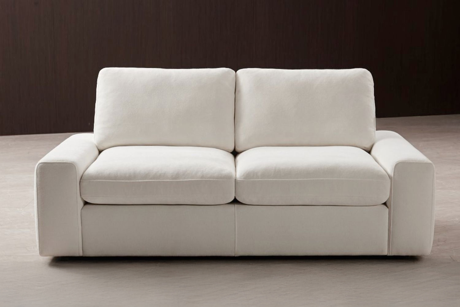 Modern Design with Clean Lines and Curves: The sofa features a contemporary aesthetic with clean lines and soft curves. Its square-shaped base and rounded armrests provide a sleek yet inviting profile, perfect for modern living spaces.