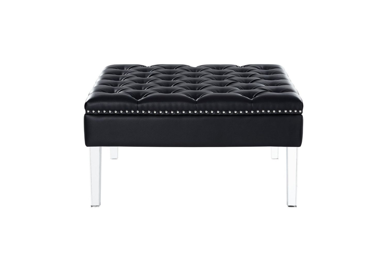 Introducing the CLOVER Button Tufted Cocktail Ottoman, a luxurious addition to any living space. Upholstered in dark-colored PU leather, this ottoman exudes elegance and durability. The button-tufted design on the generously cushioned top adds classic charm and ensures lasting comfort. With Acrylic legs for stability, it's a versatile and stylish accent piece for any room.