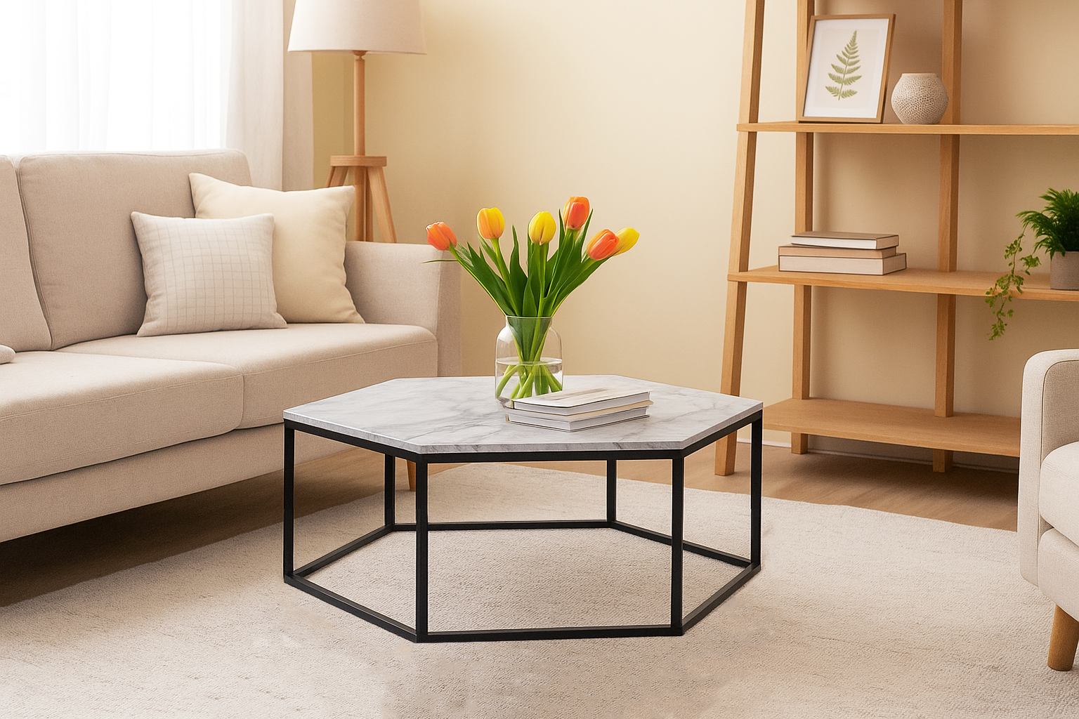 The GRAYS coffee table has a conventional hexagon-shaped top, with a wood veneer look, and sits on a strong matt black steel base. This is a great alternative to a conventional round coffee table and saves a bit on space too.