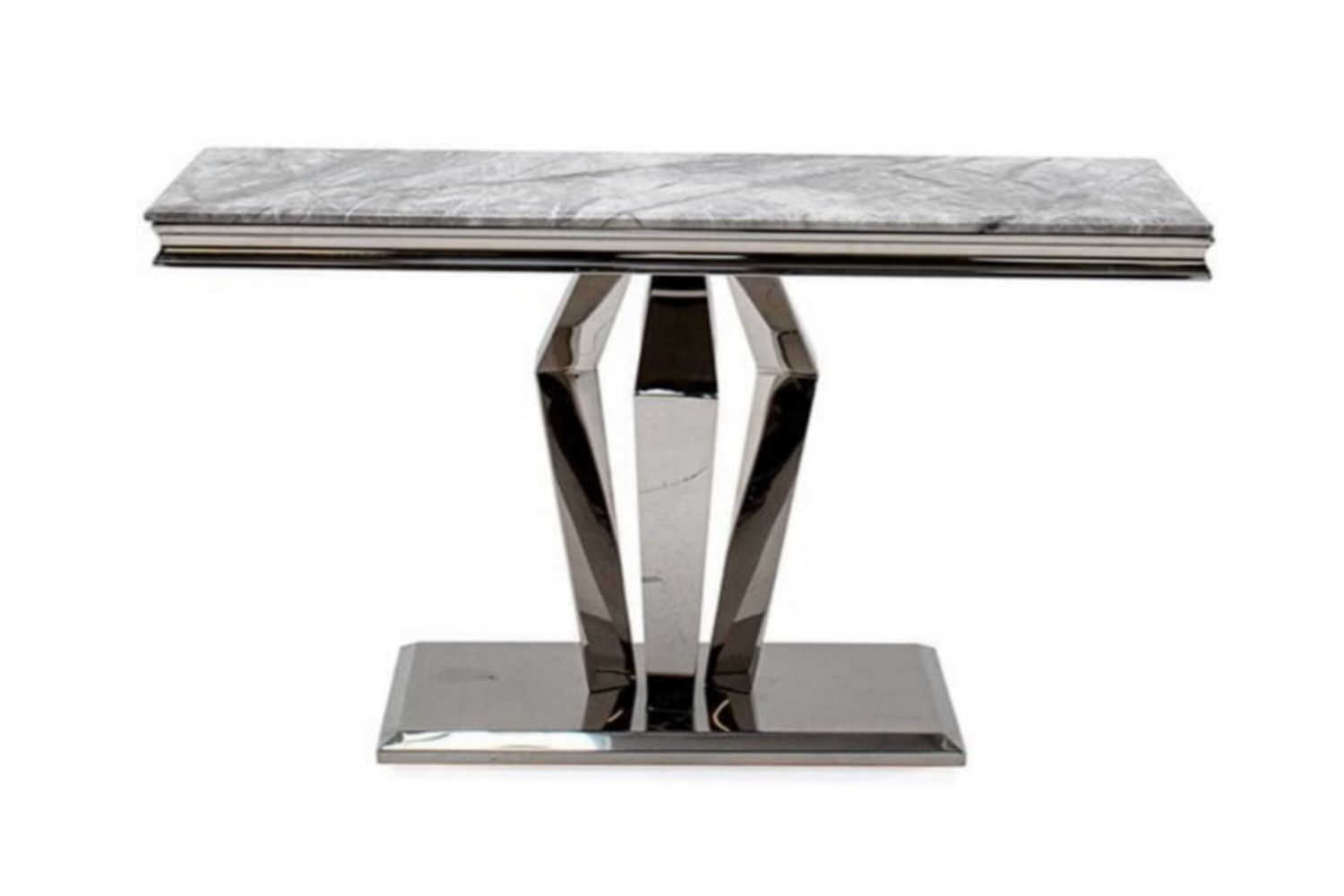The chic design of the OPERA console table offers a newfound elegance to your home. This console table features a natural, grey marble tabletop and a cool table base to go with it. The contrasting pedestal base in a Diamond design adds a modern vibe. This table is not only a show stopper but all a timeless beauty that will last year after year.