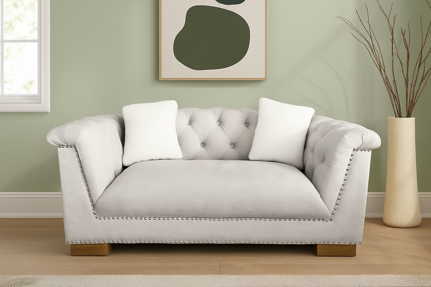 The MALMO Sofain Beige Velvet is an opulent ensemble designed to exude luxury and comfort effortlessly. Crafted with indulgent beige velvet upholstery, this set of sofas promises a plush seating experience, inviting you to sink into its soft embrace. Its sturdy wooden legs not only provide stability but also add a touch of classic elegance to the overall aesthetic. The silver nail decorations delicately tracing the edges showcase exquisite detailing, elevating the sophistication of the design. The included two pillows, designed to complement the beige velvet, serve as stylish accents, adding both visual interest and comfort to the set.