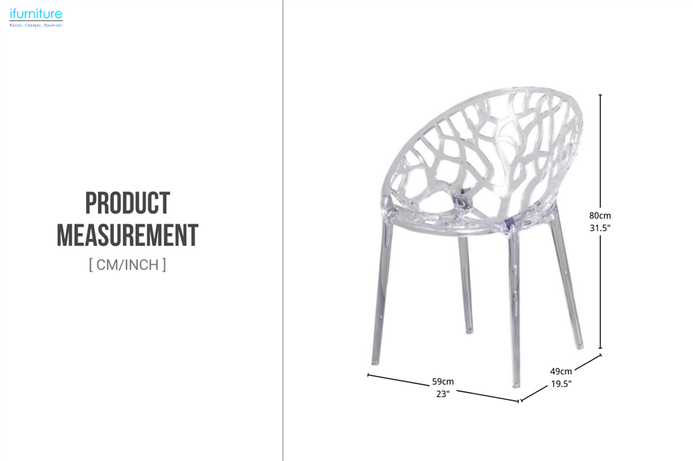 This chair has a modern web-like pattern on the backrest and is made from durable, transparent Polycarbonate (PC) for impact resistance and heat tolerance. Lightweight yet sturdy, it offers ergonomic support and suits both indoor and outdoor settings.