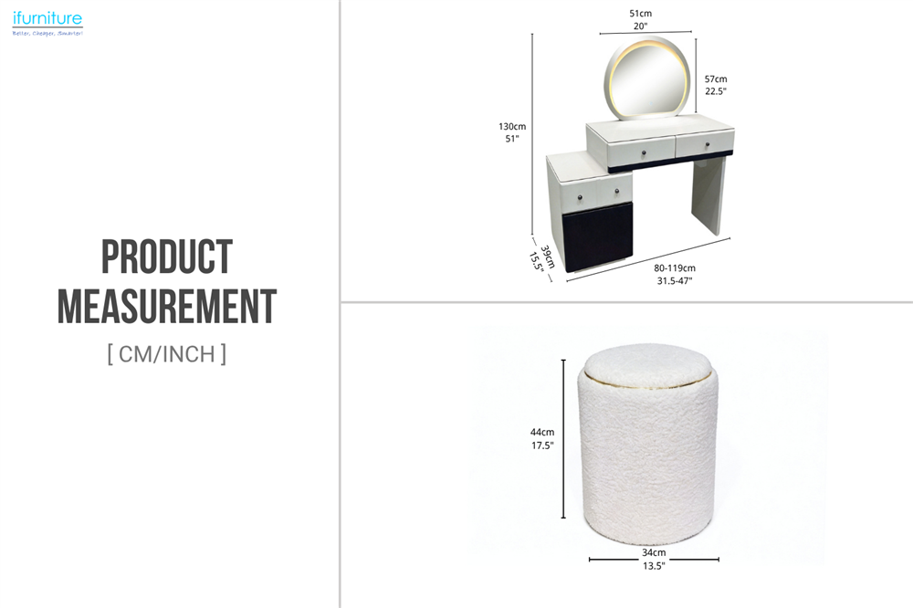 The dressing table with stool set combines smart functionality with modern style. Featuring a touch-control LED mirror with three lighting modes, a durable tempered glass tabletop, and an expandable, reversible design, it also offers practical storage with three drawers and a door cabinet. Paired with the soft teddy fabric stool accented by elegant golden trim, this set delivers comfort, versatility, and a refined contemporary look for any bedroom or dressing space.