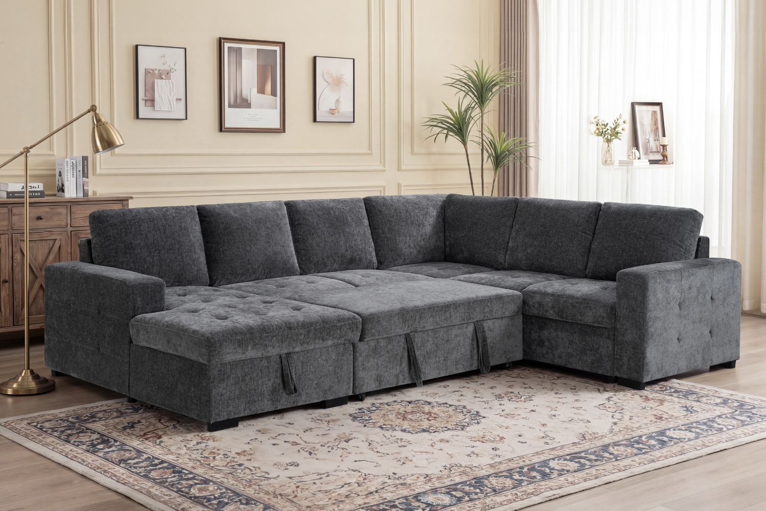 Convertible Pull-Out Sleeper Bed: The centre seat module pulls out, creating a wider, flat surface that converts the sectional into a sleep-ready bed/lounge area for guests.