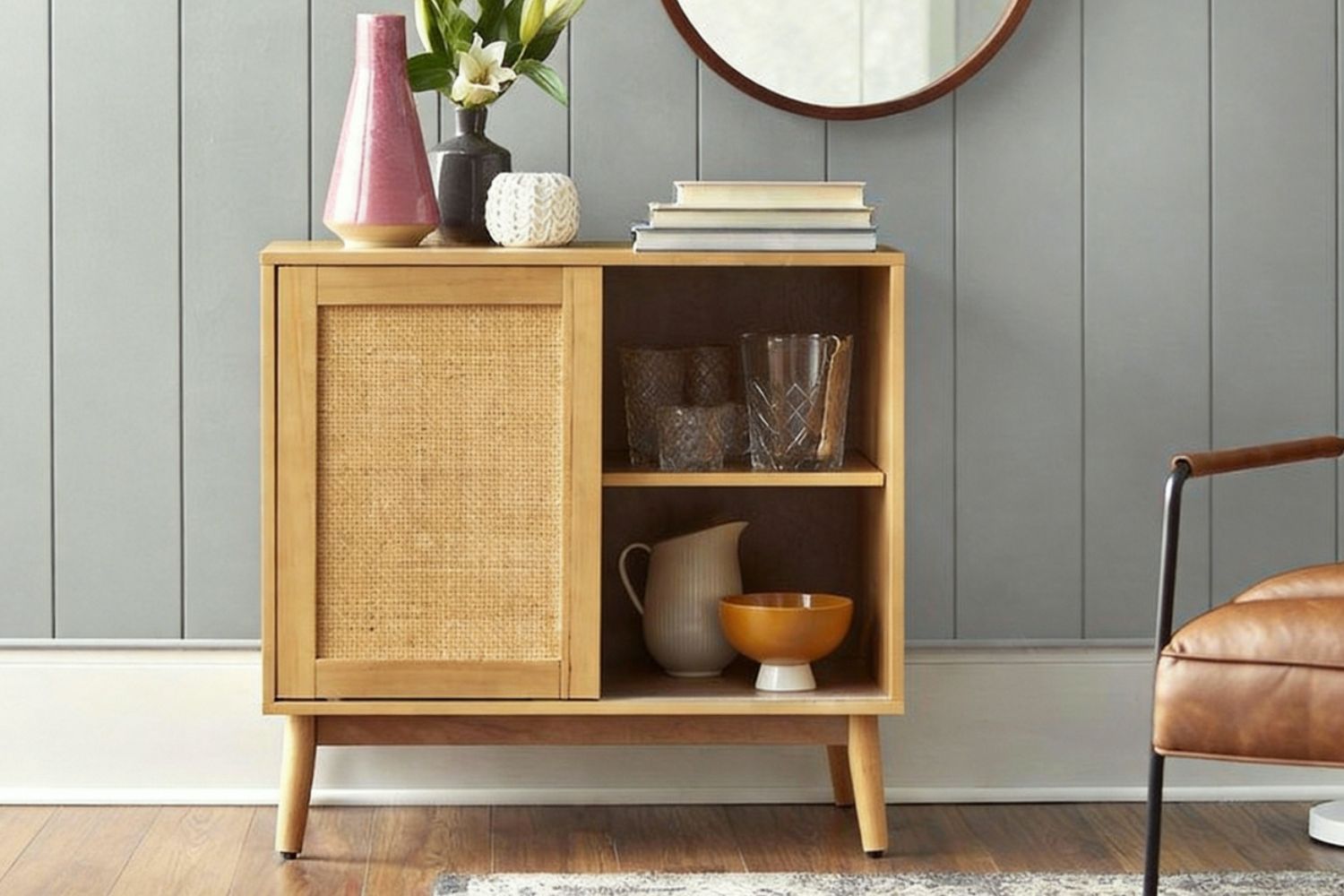 • Rattan Front: The woven rattan door panels add visual interest and a warm, natural texture to the piece.