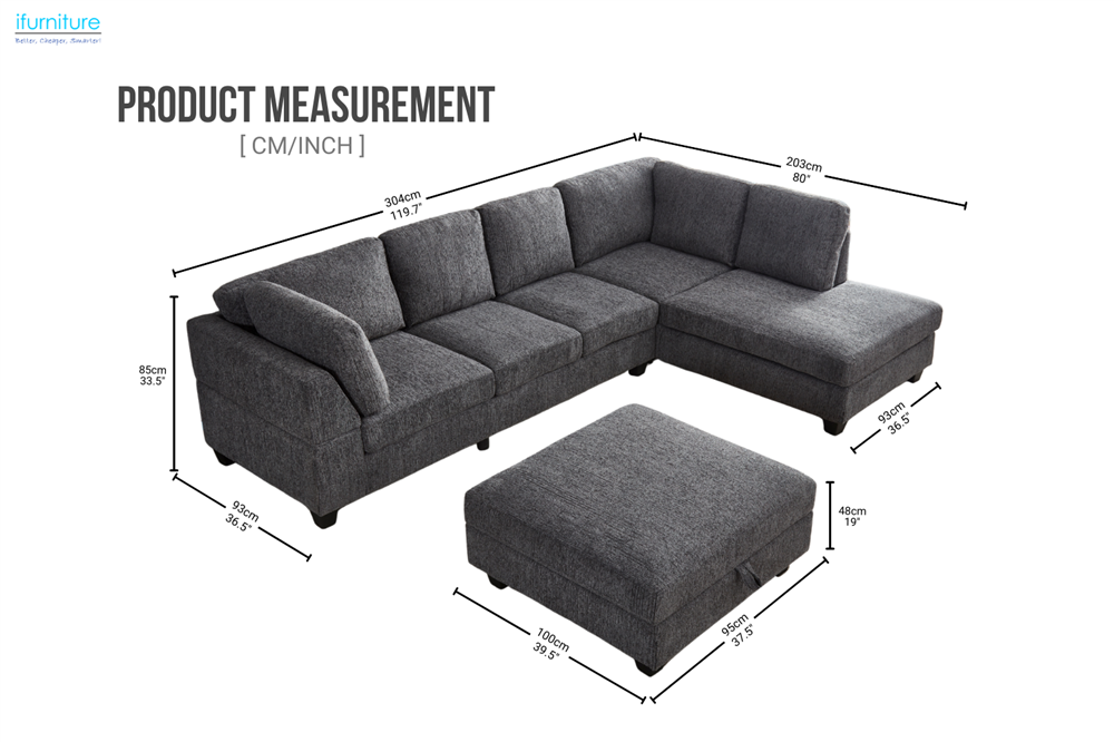 LIBERTY Premium Chenille Fabric Sectional Sofa (Dark Grey) - Chaise Facing Right with Storage Ottoman