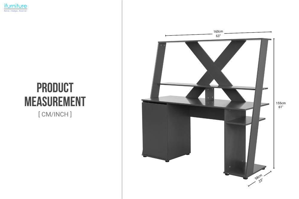 This desk is perfect for office work and home use. It features a spacious surface for dual monitors, a unique X-shaped back panel, and ample storage with an open shelf and cabinet. The right side offers space for a computer tower or other peripherals, all with an easy-to-clean melamine surface and modern design.