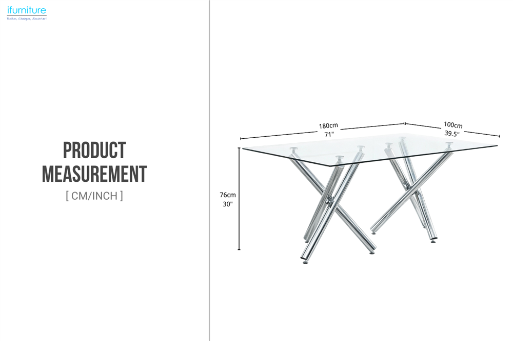 The LUMIX Dining Table features a spacious 180cm tempered glass tabletop with sleek, durable metal legs in a stylish crossed design. Perfect for modern dining spaces, it combines elegance and practicality with easy-to-clean glass and sturdy support.