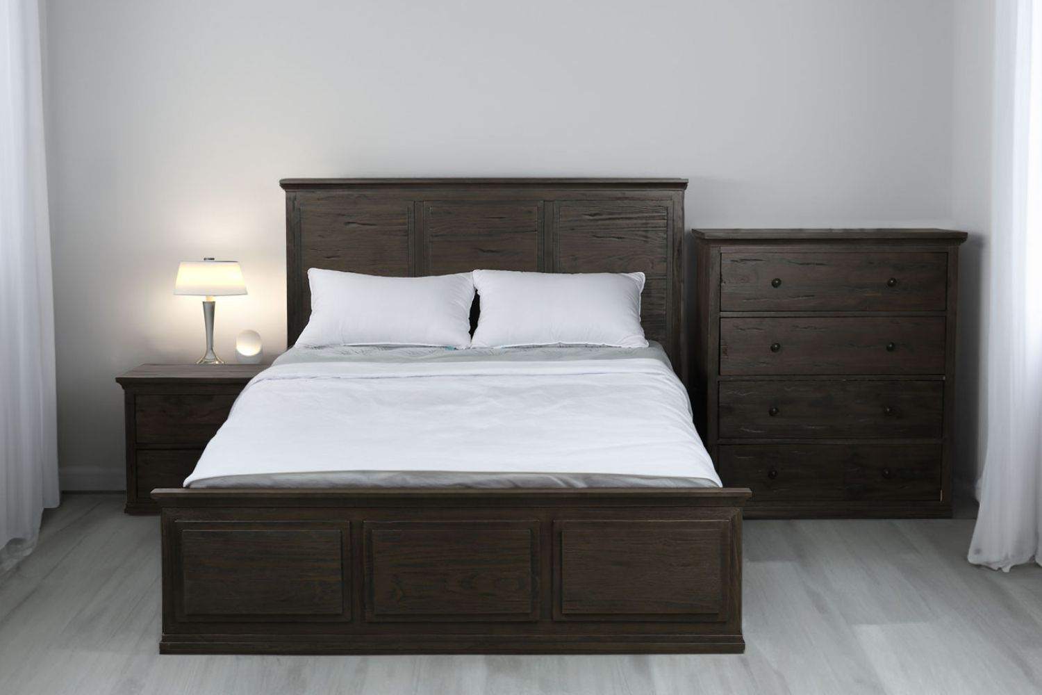 Introducing the MADISON 4PC Bedroom Range in Queen Size, exuding timeless sophistication with its Dark Grey finish and solid New Zealand pine wood construction. This comprehensive set includes a sturdy bed frame, two practical bedside tables, and a versatile tallboy, offering a complete bedroom solution. The Queen size bed frame provides spacious comfort for restful nights, while the two bedside tables offer convenient storage for your nighttime essentials. The tallboy's ample storage space ensures your room stays organized. Elevate your bedroom decor with the MADISON 4PC Bedroom Range, combining style, durability, and practicality in one elegant package.