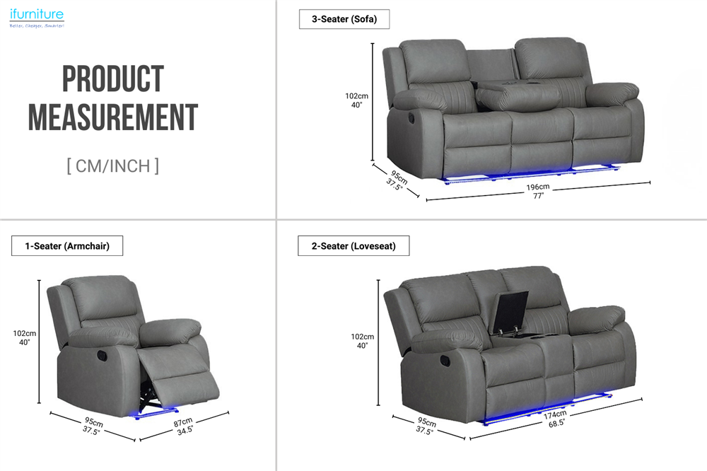 MARVIN Air Leather Manual Reclining Sofa Range with LED & Console & Wireless Charger (Grey)