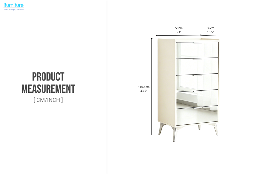 This 5-drawer chest features a sleek champagne finish with mirror accents and polished metal legs, offering stylish storage for clothes and essentials. The aluminum handles add an upscale touch, perfect for modern rooms.