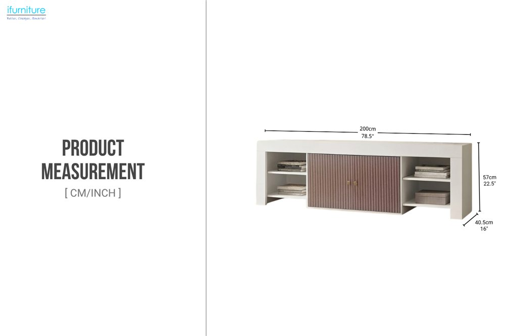 Clean, modern, and built for big-screen set-ups, the NELM 2M TV UNIT pairs a crisp white frame with a warm, oak-tone fluted double door and slim golden knobs. Two open, two-tier shelves on each side keep consoles and décor in easy reach, while the centre cabinet hides clutter for a calm, organised living room. Crafted from durable engineered wood with a smooth, easy-clean finish.