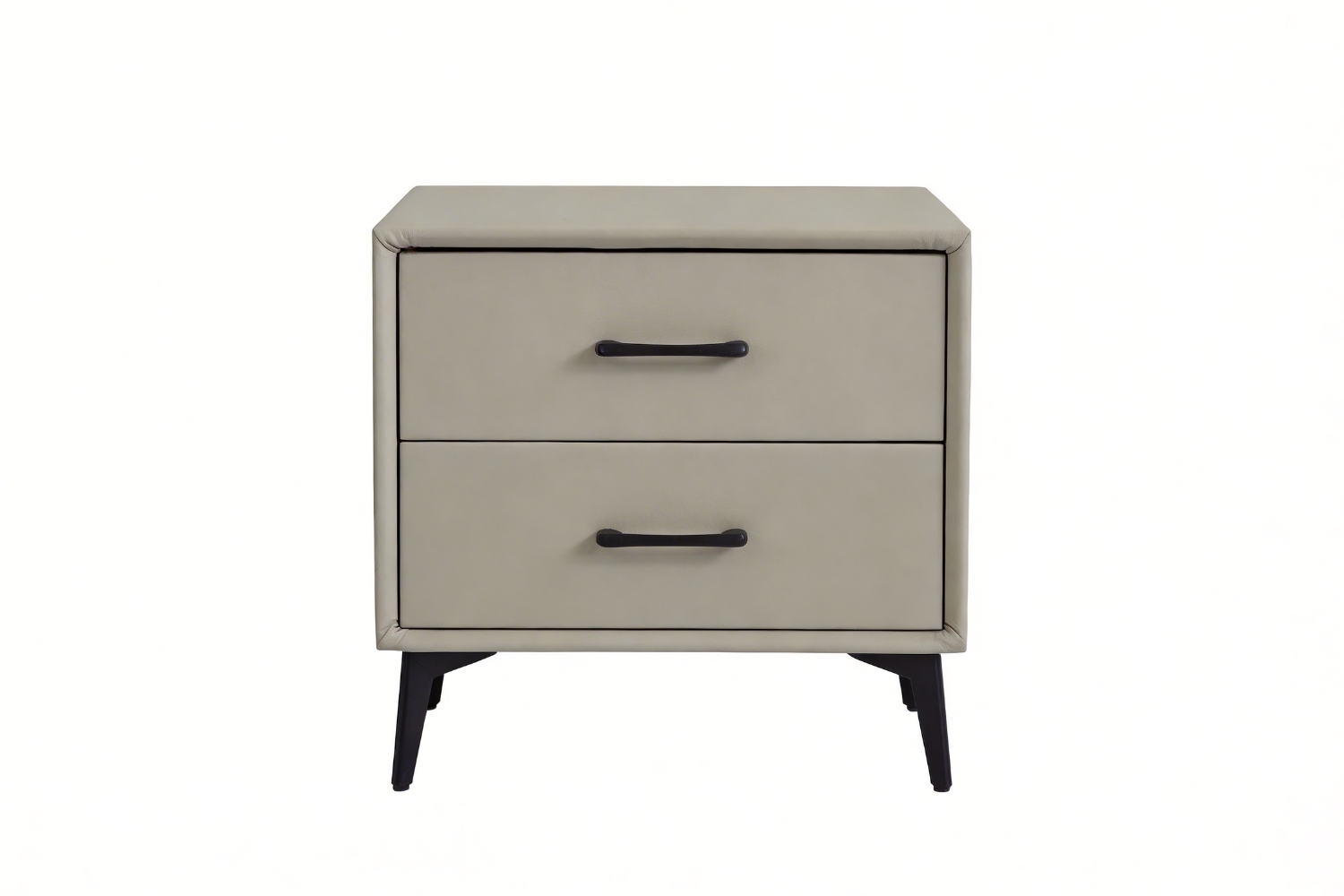 This bedside table features smooth vegan leather upholstery and a clean, minimalist design. With two practical drawers for everyday storage, sleek black handles, and tapered legs that lift the unit slightly off the floor, it offers both style and functionality for contemporary bedrooms.