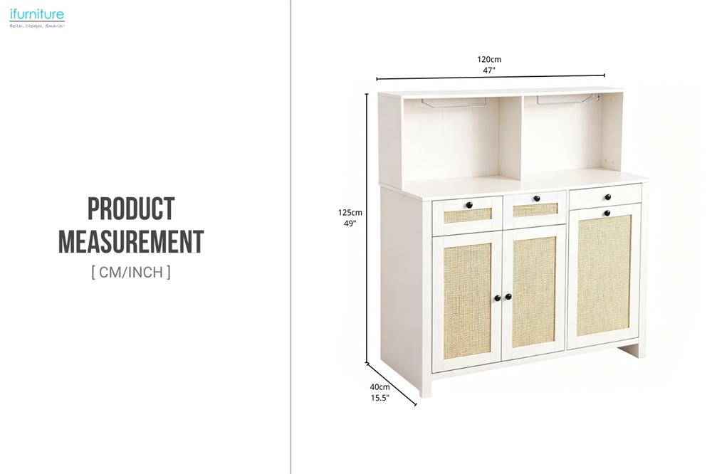 This versatile cabinet offers ample storage with a spacious top, three drawers, adjustable shelving, and stemware racks for organised living. Featuring remote-controlled LED lighting, a convenient tilt-out trash bin, and woven plastic rattan accents, it adds both functionality and a stylish touch to any space.