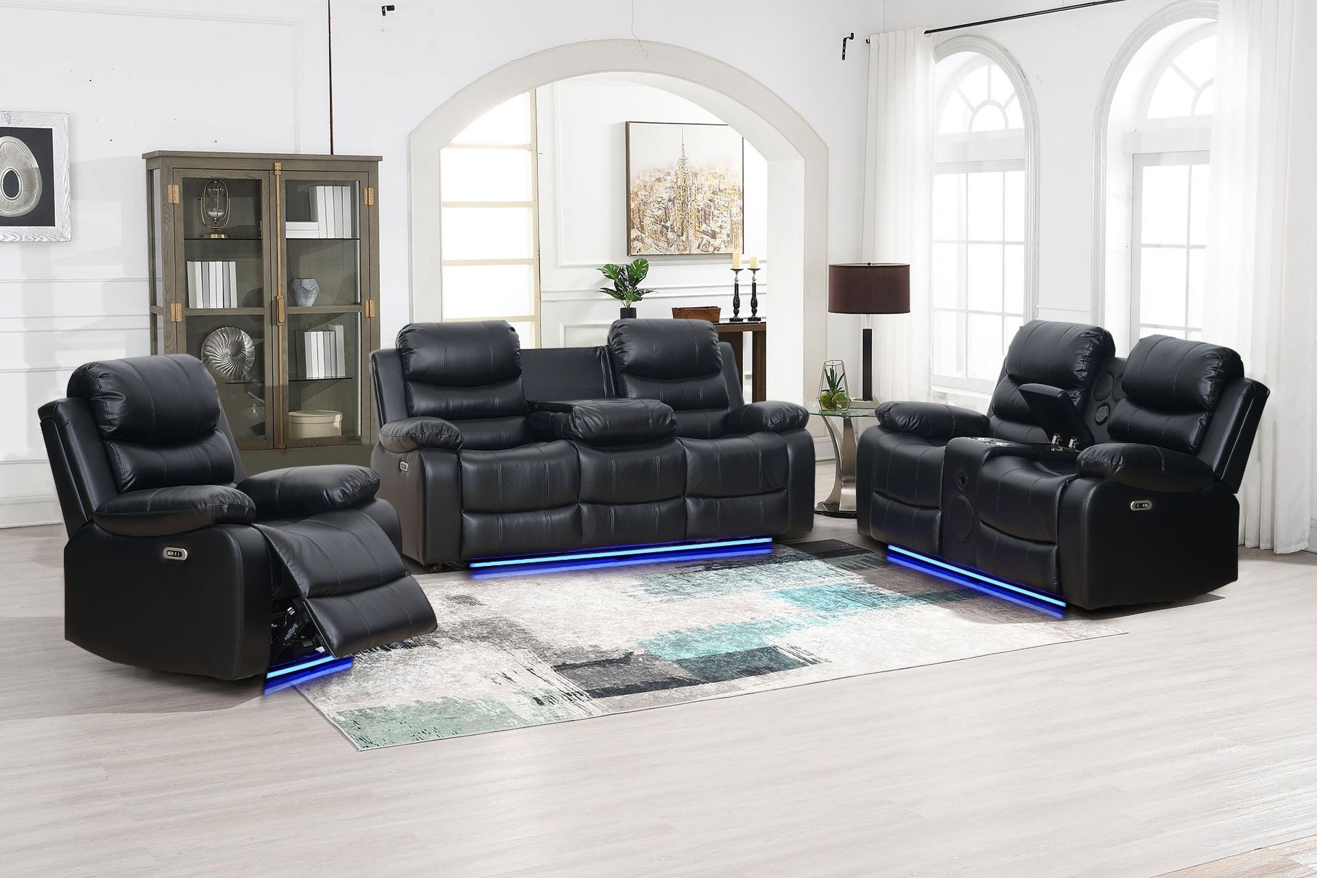 This power reclining sofa range features durable air leather upholstery and a solid poplar wood frame for everyday comfort and support. Smooth electric reclining allows the backrest to adjust up to 150°. The 2-seater includes a centre console with a Bluetooth speaker, cup holders, and storage, while the 3-seater offers a drop-down console with cup holders and a table surface. Integrated USB charging and blue LED base lighting add everyday convenience and a home theatre-style atmosphere.