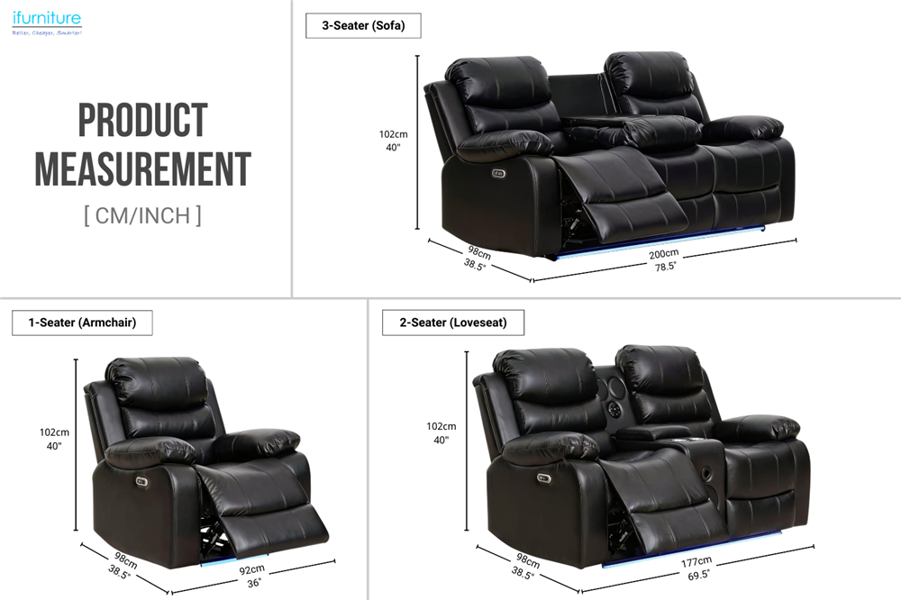 This power reclining sofa range features durable air leather upholstery and a solid poplar wood frame for everyday comfort and support. Smooth electric reclining allows the backrest to adjust up to 150°. The 2-seater includes a centre console with a Bluetooth speaker, cup holders, and storage, while the 3-seater offers a drop-down console with cup holders and a table surface. Integrated USB charging and blue LED base lighting add everyday convenience and a home theatre-style atmosphere.