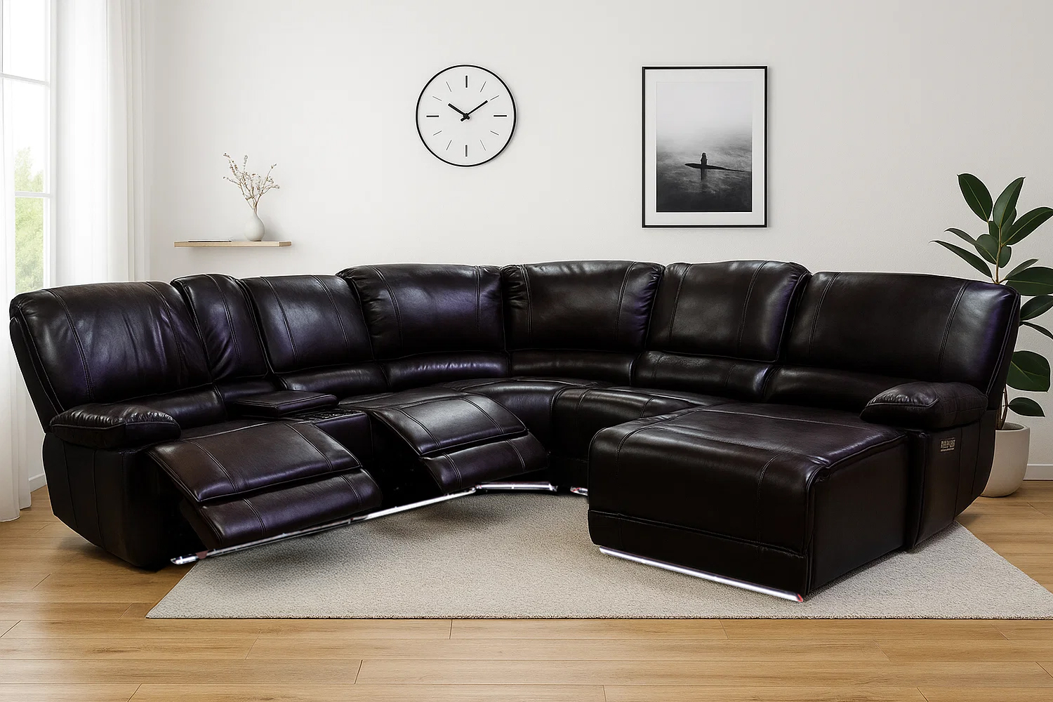 Experience the ultimate in comfort and modern style with the Orren Air Leather Sectional Power Reclining Sofa. This luxurious piece features premium air leather upholstery and a sophisticated black finish. With its right-facing chaise, LED lighting for a vibrant ambience, a storage compartment and built-in cooling cup holders, this sectional offers unmatched relaxation. Designed with a combination of larch & and engineered wood frame, it ensures both style and functionality for any contemporary living room or entertainment space.