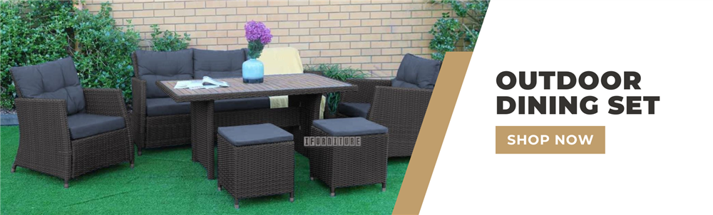 The ISLA 6pc outdoor set is made of enduring man-made rattan and consists of 3 seater sofa, 2 single chairs, a dining table, and two ottomans. The rattan cord material is half-round in shape, with each pair of cords having one in brown colour, and one in grey. This creates an interesting brown/grey colour. All seats have thick, comfy cushions which are zip-off, and removable from the furniture; even the ottomans have cushions as well. The dining table is a blend of rattan frame, and a durable, patterned, hardwood top. Ready for summer entertaining!