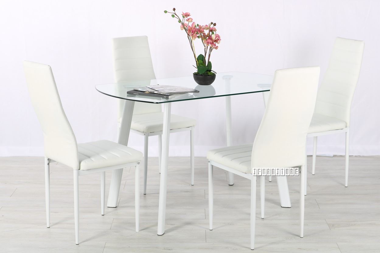 The 5pc PENTA dining set is another smaller unit, just right for those smaller spaces. The table top is of 8mm, clear, tempered glass, which creates a feeling of space -even in the tiniest area- since our eyes look 'through' the clear top and see items beyond. The table legs are the powder coated metal tube, the same for the chair legs and frame. The chairs are padded and covered in white PU synthetic leather.