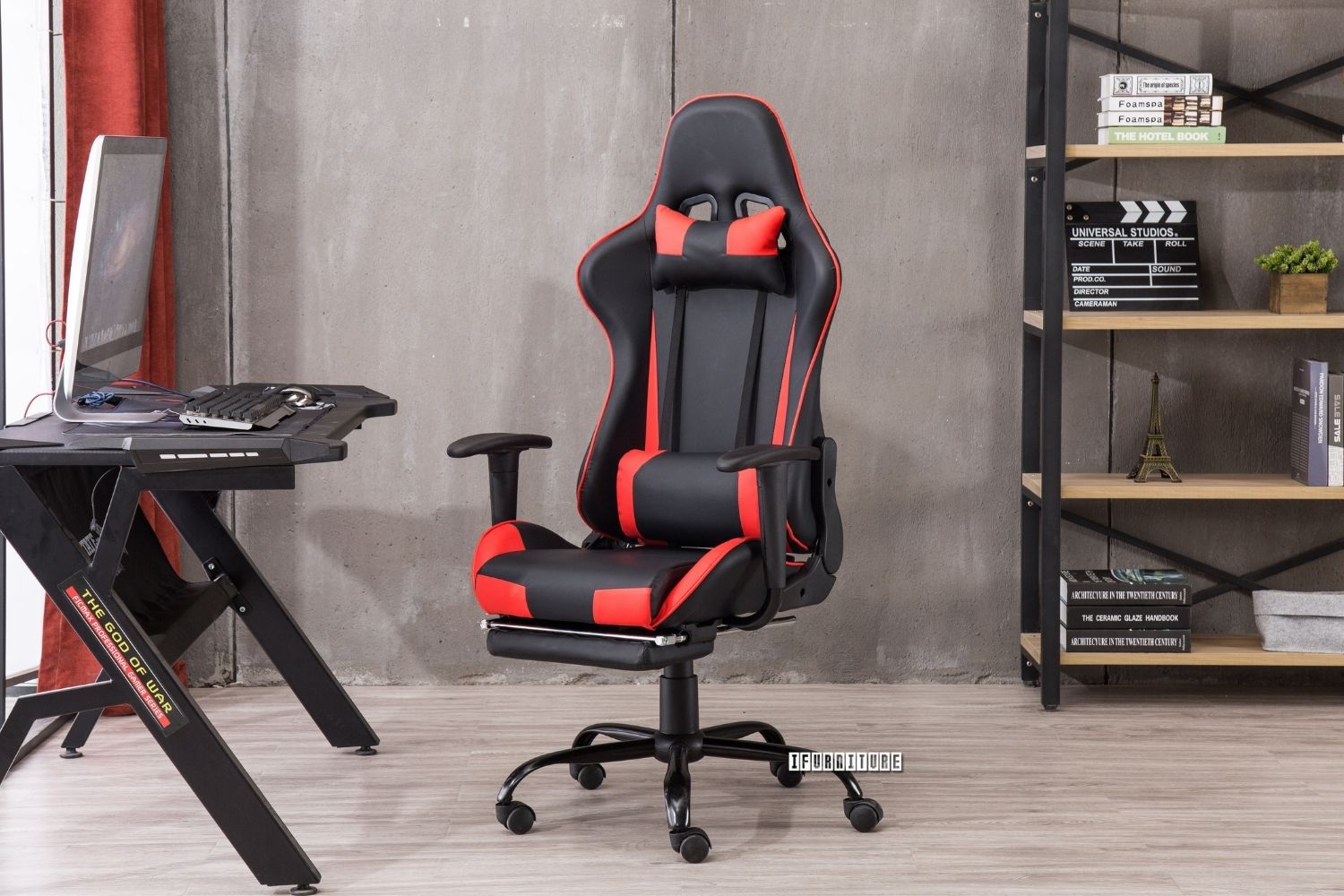 Looking for a gaming chair for your new gaming experience? RACER can enhance your gaming at home! It is not only the look, RACER is also ergonomic to support your long gaming hours. It is PVC upholstered in black and red with a padded seat for comfort. Your head and lower back are also supported with its adjustable headrest and lumbar cushion. When you need a break from tough shootings, simply slide out the footrest and recline back. When your energy is replenished, adjust back and continue gaming with ease. Ready to game? Game with RACER!