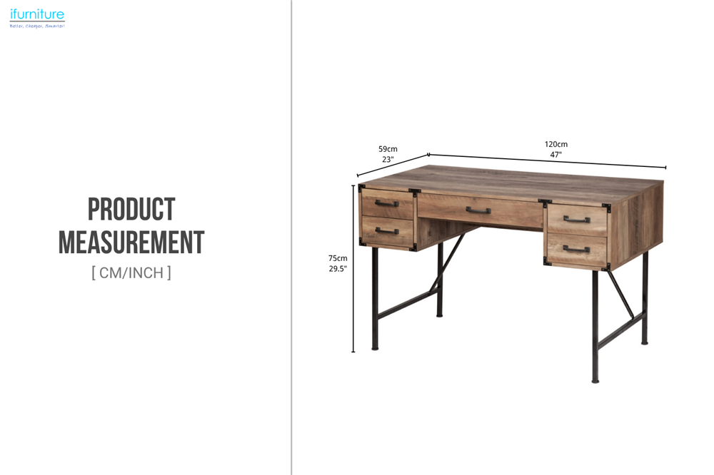 This writing desk features a spacious work surface for writing and laptop use, with five drawers for ample storage to keep your workspace organized. The industrial black metal legs with diagonal braces add strength and style, while the rustic oak finish enhances its warm, earthy appeal.