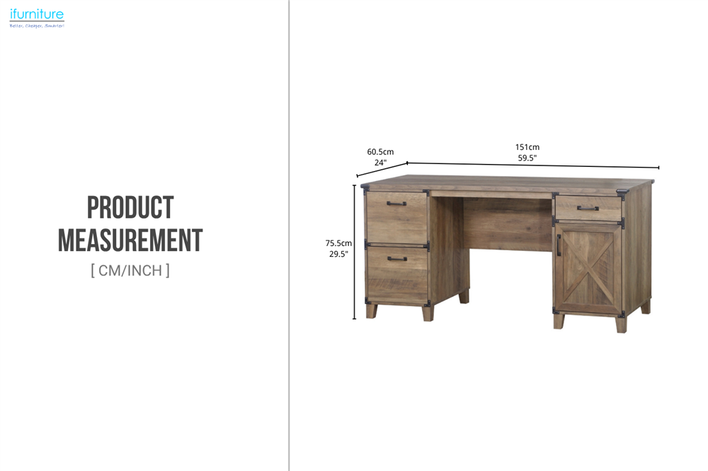 • Rustic Industrial Design: Featuring a rustic wood finish, black metal accents, and an X-shaped cabinet door design, this desk brings industrial charm to any office.