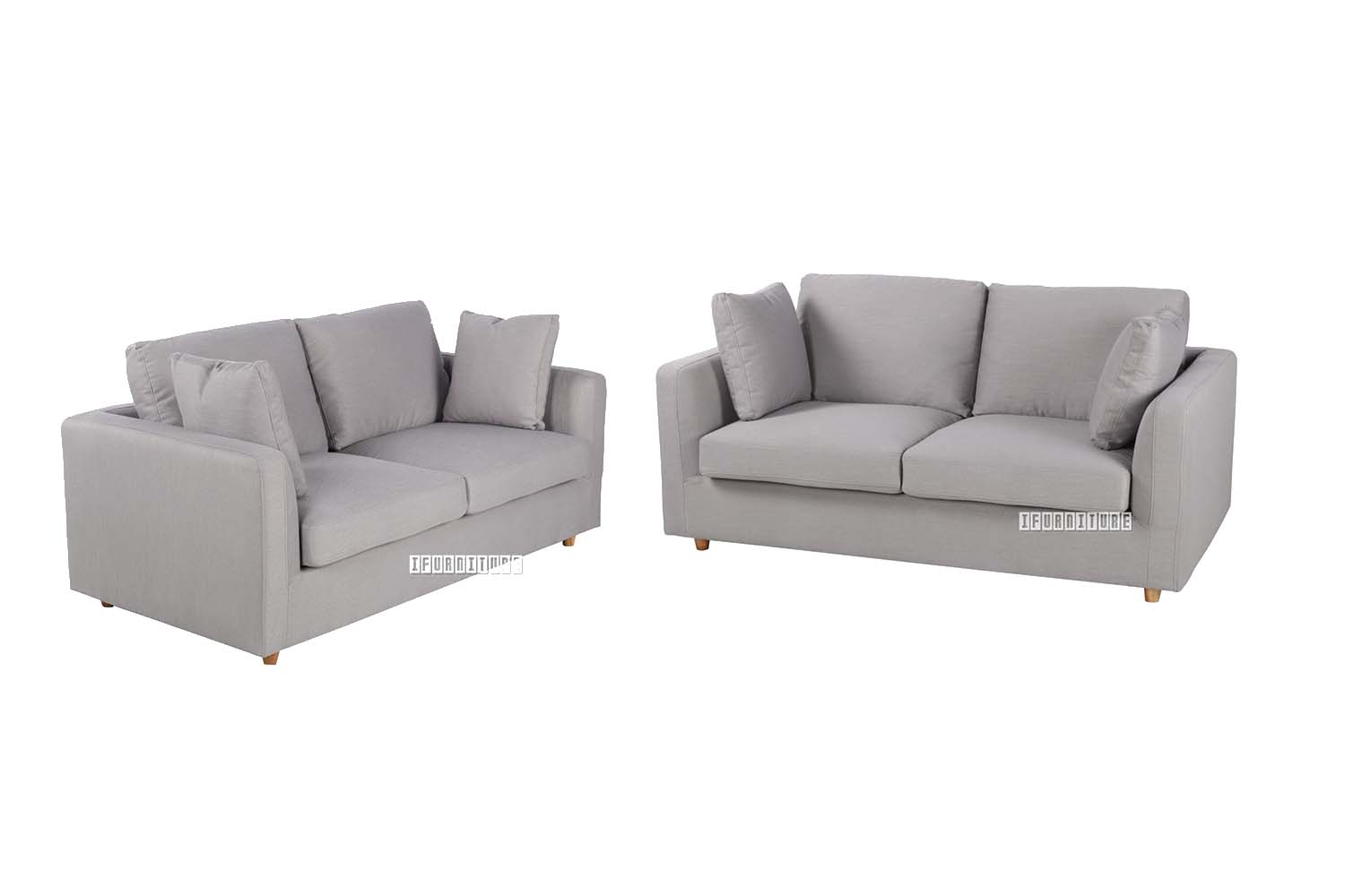 The SOMERSET series comprises a 2 & 3 seater in a modern, smooth-cornered style. The seats are comfy and supportive. Sofas are upholstered in either a light or dark grey, durable fabric. Each sofa has two smooth back cushions and two seat cushions, plus two occasional cushions for use where most needed. The short solid wood legs are a light brown color, and match nicely. All cushions have zip-off covers, making cleanup easier.