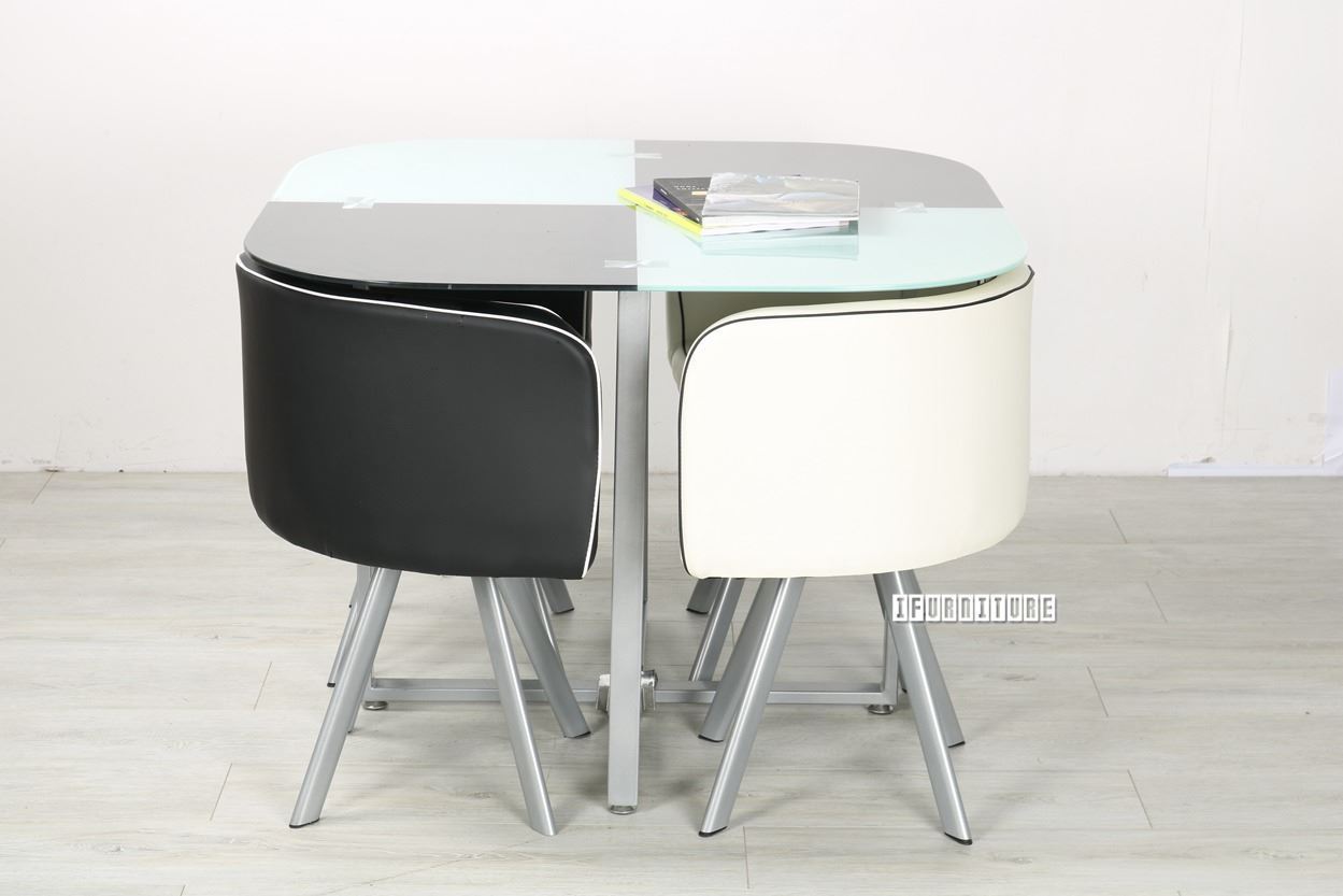 The 5pc TECA dining set is a space-saving marvel, the chairs hide under the table, so the ‘footprint’ of the table and chairs is only 100x100! The table top is 10mm tempered glass in a black and white pattern, while the frame and legs are powder coated steel. Following the B&W theme, two chairs are white, and two black.