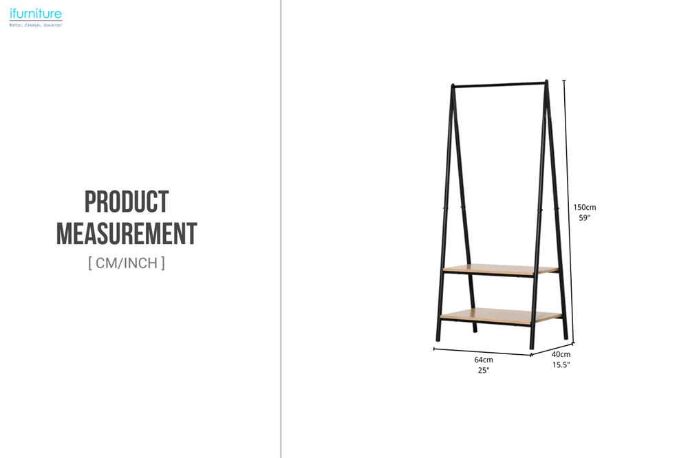 • Stylish and Functional Design: Featuring a sleek black metal frame and wooden shelves, this clothing rack combines modern aesthetics with practical storage solutions.