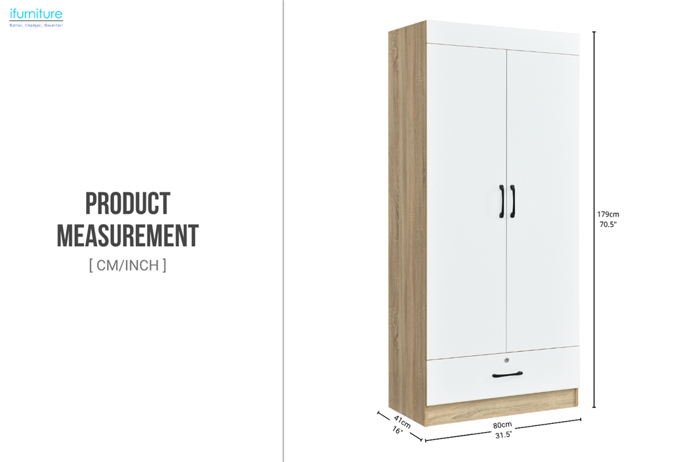 This modern wardrobe offers smart organization in a stylish design. It features a spacious hanging section for shirts, coats, and dresses, along with a handy shelf for folded items or storage boxes. A lockable bottom drawer keeps personal belongings secure, while sleek black handles and a two-tone oak and white finish add a clean, contemporary touch that complements any bedroom décor.