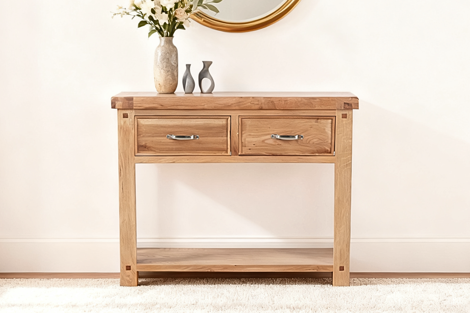 The WESTMINSTER 2-Drawer Console Table embodies sophistication and functionality with its solid oak craftsmanship. Featuring two drawers, this console table seamlessly combines practicality with timeless design, offering ample storage space. Crafted from durable oak, it exudes warmth and durability, showcasing the natural grain patterns inherent in the wood. Whether in an entryway, hallway, or living room, this console table stands as a versatile and elegant addition, blending classic design with the practicality of storage solutions. Elevate your space with the enduring beauty and functionality of solid oak in this statement piece.