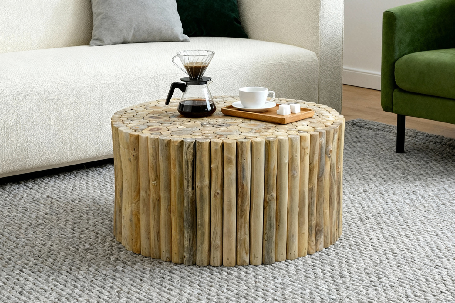 This round coffee table features a stacked teak branch base, forming a unique cylindrical frame with rich natural texture. The smooth circular tabletop provides ample space for daily use, blending practicality with natural beauty. Ideal for rustic, bohemian, eco-inspired, or modern interiors, it adds a touch of organic elegance to any space.