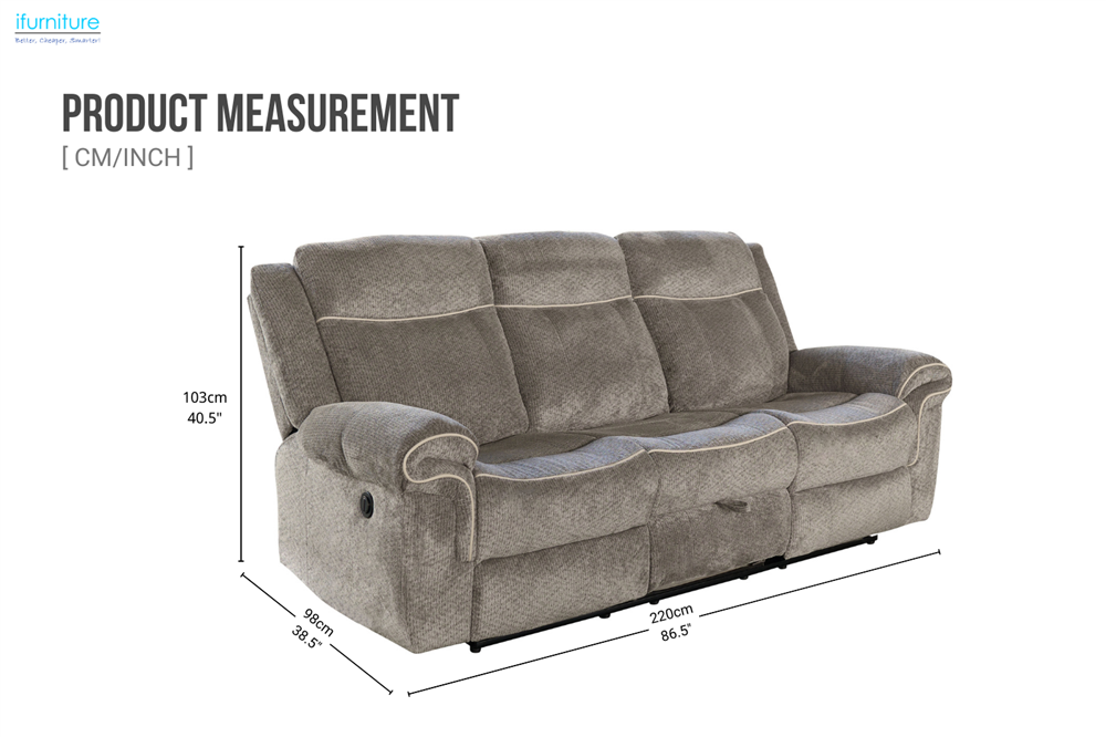 This 3-Seat Reclining Sofa features soft, textured fabric upholstery and supportive foam cushioning for lasting comfort. The smooth power reclining mechanism allows effortless relaxation at the touch of a button. It also includes a wooden drop-down console with cup holders, a pop-up power socket, and a hidden storage drawer. Its neutral tone seamlessly complements both warm and contemporary interiors.